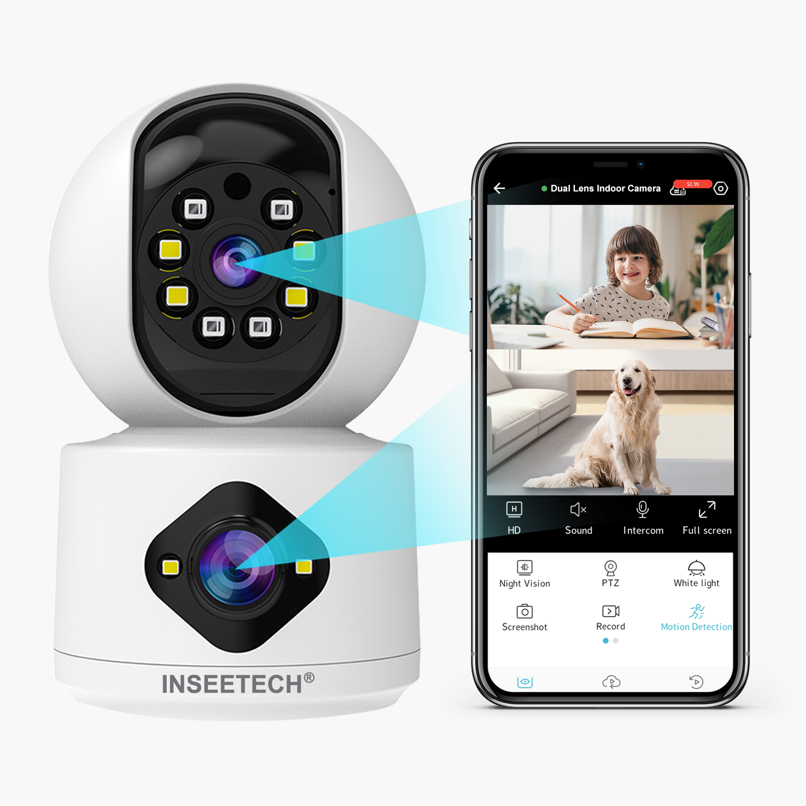 Boost home security with our 5MP Dual Lens WiFi Cam. 2.4GHz Smart Pet Security, wireless nanny cam, auto-recorded door camera, continuous video, 2-way sound—your all-in-one solution for peace of mind.