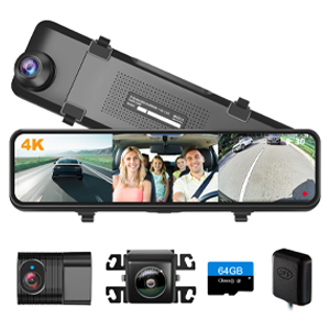 3-Channel Mirror Dash Cam 10.88" 4K+1080P+1080P Triple Rear View Mirror Dash Camera Front Inside Rear with WDR G-Sensor GPS Parking Assistance, with Free 64GB Card, Waterproof Backup Cam for Car RV
